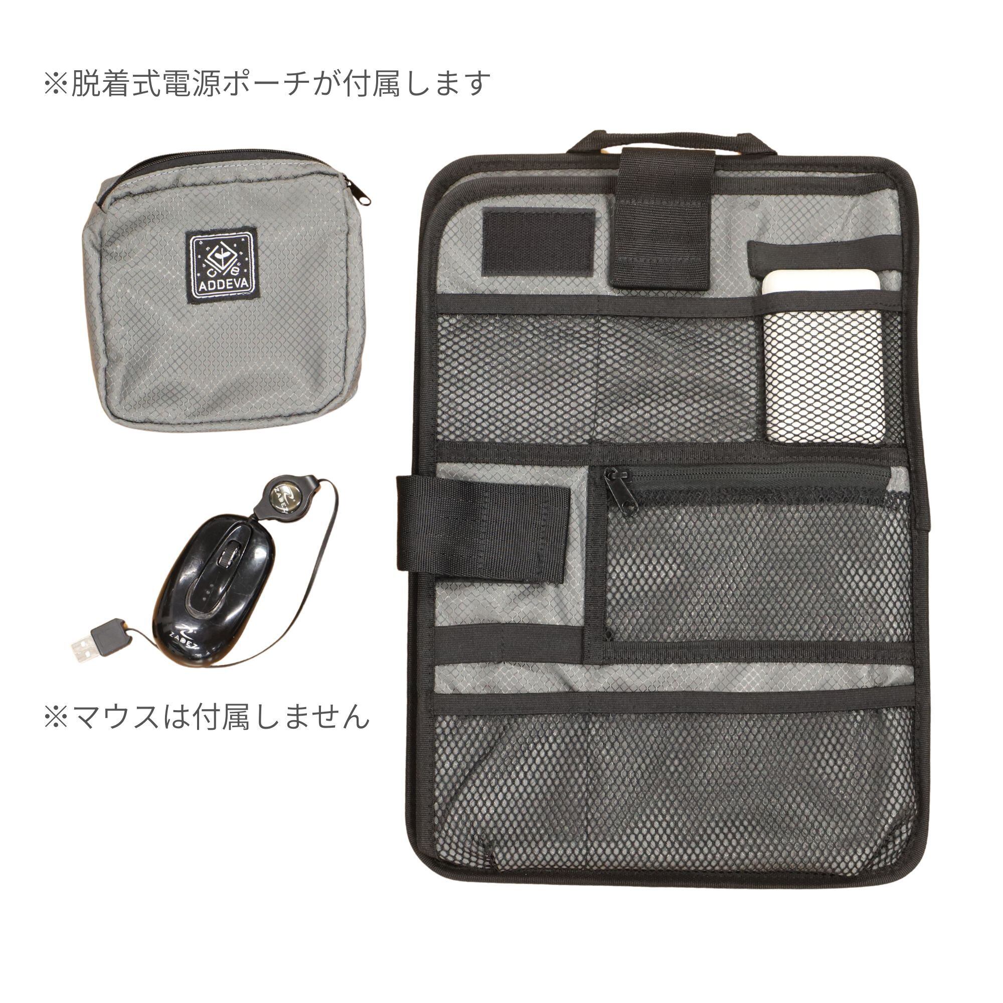 ・着脱式スクエアポーチ:ACアダプターやマウスをまとめて収納、面ファスナーでワンタッチ脱着